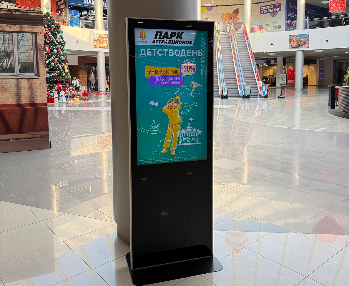Реклама в ТРЦ Град позволяет брендам работать с огромным потоком посетителей и формировать устойчивую узнаваемость в рамках всего региона и ближайших областей. Digital-реклама Град размещается на 26 экранах в ключевых зонах высокой проходимости, обеспечивая высокий уровень внимания аудитории. Реклама в торговом центре Град эффективно воздействует на посетителей при покупках и досуге.