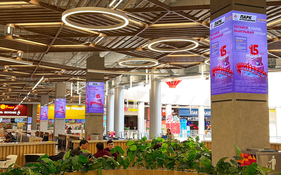 Сити-парк предлагает уникальную инфраструктуру: крупнейший в Европе крытый парк аттракционов, детский город профессий КидБург, океанариум, кинотеатр на 9 залов, игровые зоны и концертную площадку МТС Live Холл. Такой формат торгового центра формирует разнообразный и стабильный трафик, что делает рекламу в ТРЦ Град эффективным инструментом продвижения товаров и услуг.